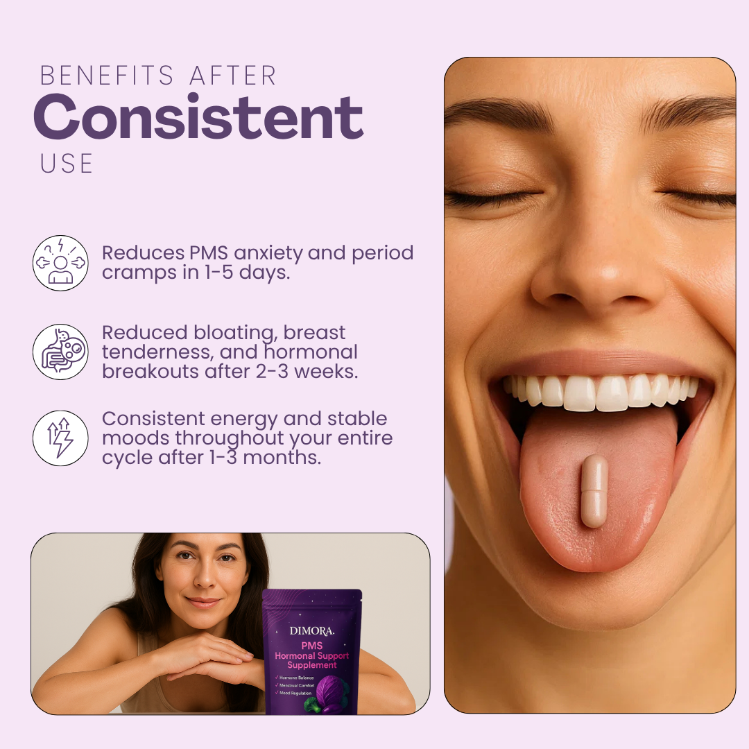 Many women notice initial improvements like reduced bloating and mood stability within 2-3 weeks, as DIM begins optimizing estrogen metabolism. The full hormone-balancing effects typically develop over 2-3 months of consistent use, as your body establishes healthier hormone ratios and cycles. Some women feel subtle improvements within the first few days from ingredients like Magnesium and B6. But here's the key - this isn't a band-aid approach. We're training your body's hormone processing system to work better long-term, so you can finally stop living your life around your cycle.